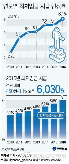 내년인 2016년 최저임금 시급이 올해보다 8.1%(450원) 오른 6,030원으로 결정되었습니다.