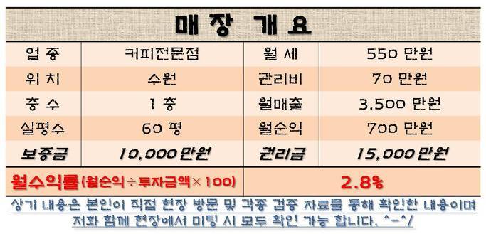수원에 좋은 상권에 위치한 이 매장의 가장 큰 장점은 저렴한 권리금입니다.