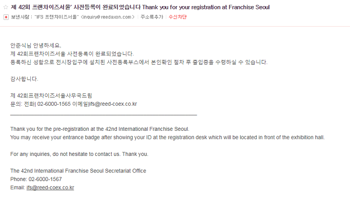 일반 사전등록과 상담을 원하는 예비창업자 중 선택을 하시어 사전등록을 하시고 다음과 같은 메일을 받으셨다면 무료 사전등록이 완료 되신겁니다.