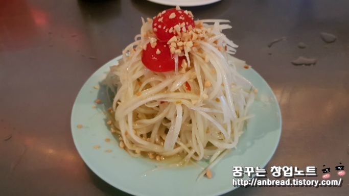 쏨땀이 먼저 나오네요. 태국 현지음식점에 가면 빼놓지 않고 주문하는 음식이죠. 상큼한 맛이 현지 식당에서 먹던 맛과 정말 비슷합니다.