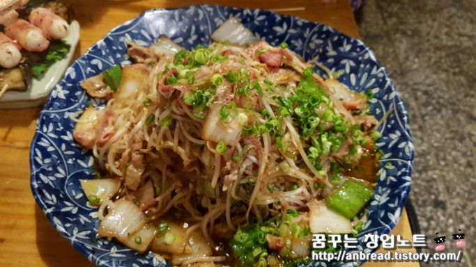 저희는 모듬 숯불 꼬치구이 10개와 삼겹살 베이컨 숙주볶음을 주문했습니다.